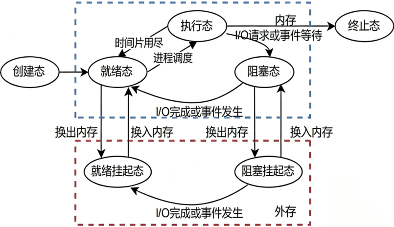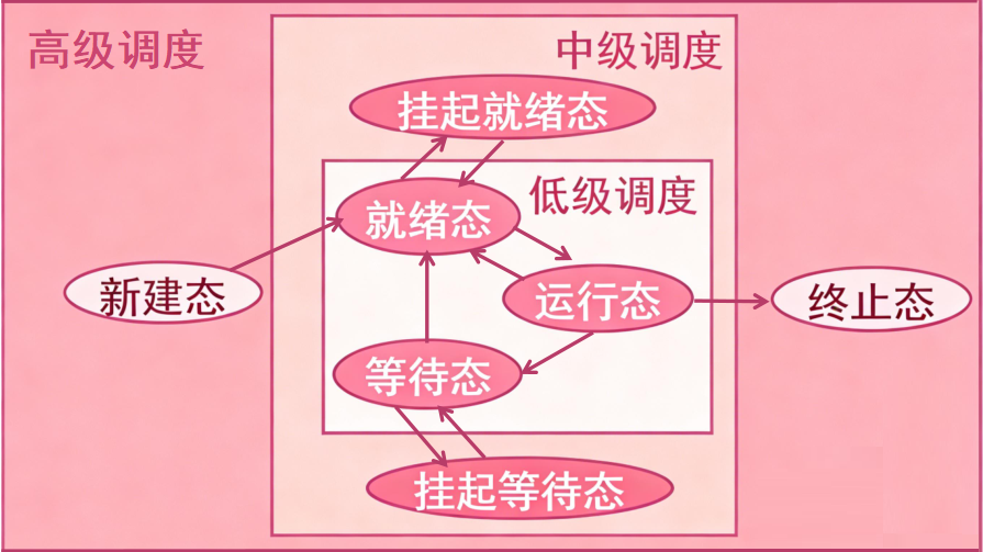 | 中级调度 / 内存调度 | 将内存中的进程调到外存,设为就绪挂起/阻塞挂起状态,以提高内存利用率 |
