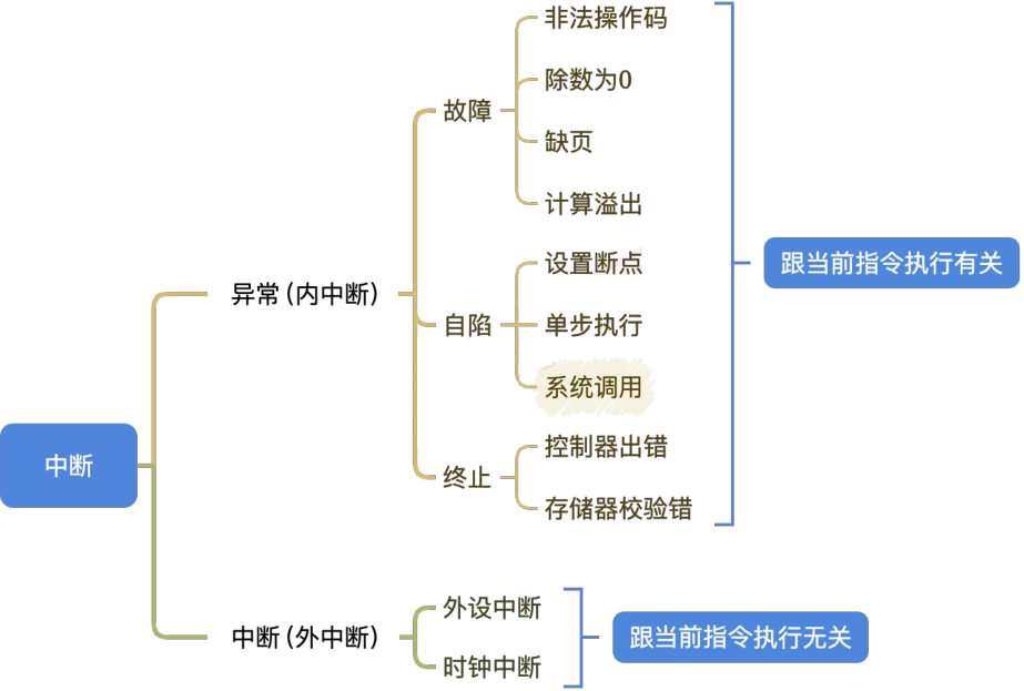 异常也称内中断,和当前执行的指令有关,由指令引起的中断。