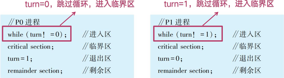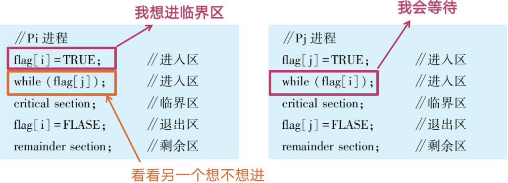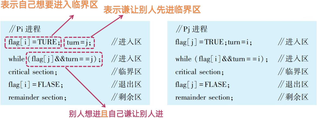 while(flag[j]&&turn==j); while(flag[i]&&turn==i); //进入区