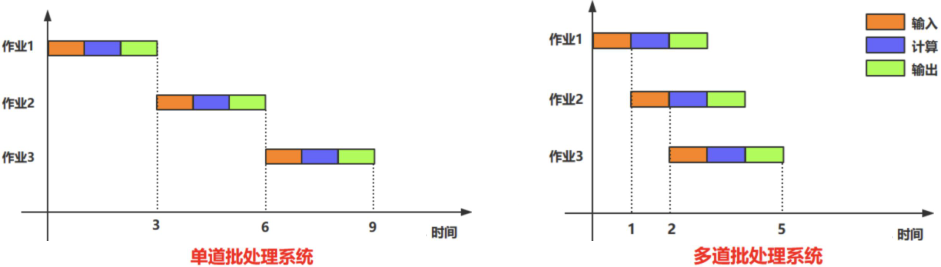 - 单道批:一次只允许一个程序运行。CPU外设利用率低、系统开销小。