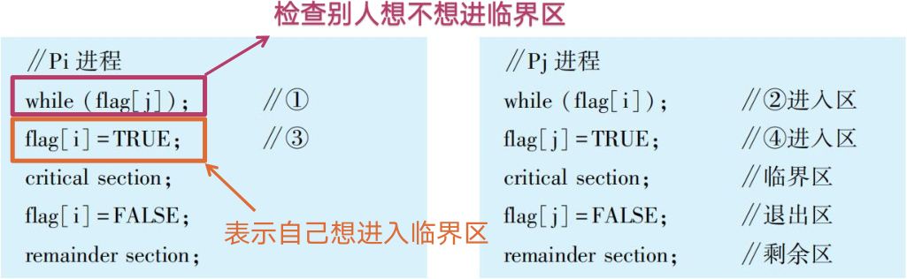 while(flag[j]); ③ while(flag[i]); ④ //进入区