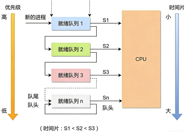 允许进程在多级队列中移动,称为多级反馈队列。各级队列优先级从高到低,时间片分配从低到高。