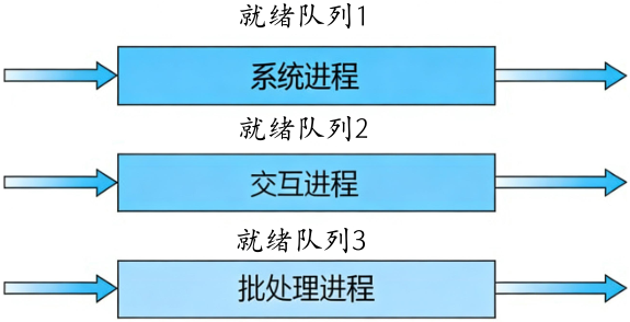 存在多级就绪队列,按不同类型或性质将进程放到不同的就绪队列中。