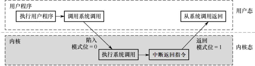 访管/陷入/自陷/Trap指令:触发在用户态,是用户态进程主动发起态转换的唯一合法指令,状态转换由硬件完成。