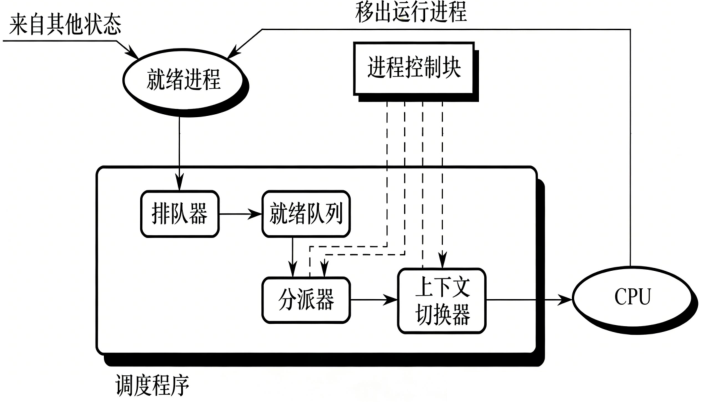 | 低级调度 / 进程调度 | 从内存的就绪队列中选择进程,分配CPU真正执行 |