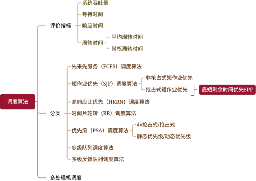 | 短作业优先 SJF | 选最短的。抢占式短作业优先又叫最短剩余时间优先SPF。 平均等待时间/周转时间均最小,长进程饥饿。 |