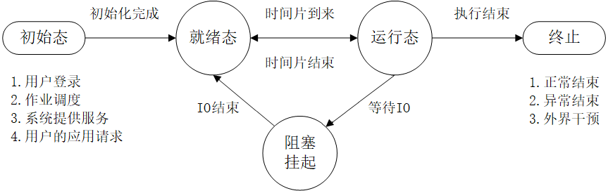 - 阻塞态不可直接变成执行态:需变成就绪态等待调度。