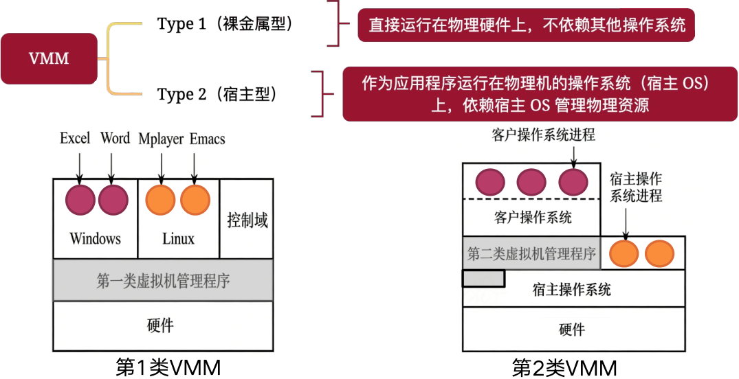 | 特权级别 | 第一类VMM > 操作系统 | 宿主机OS > 第二类VMM > 客户机OS |