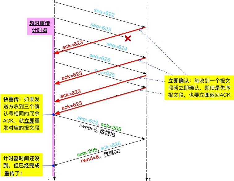 | 快重传 | 收到报文立即应答,失序报文也要立即应答,失序报文返回的是冗余应答 发送方连续收到三个冗余确认,就立即重传该位置数据 |