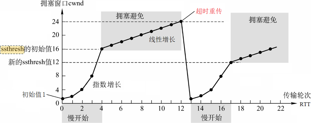 - cwnd到达ssthresh时,采用拥塞避免算法,每一批报文成功发送后,cwnd线性增长。