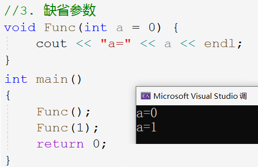 在调用函数时,若对应位置没有传入实参,则使用该参数的缺省值,反之,则使用传入值。