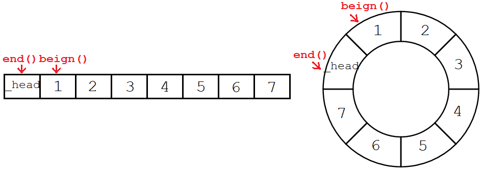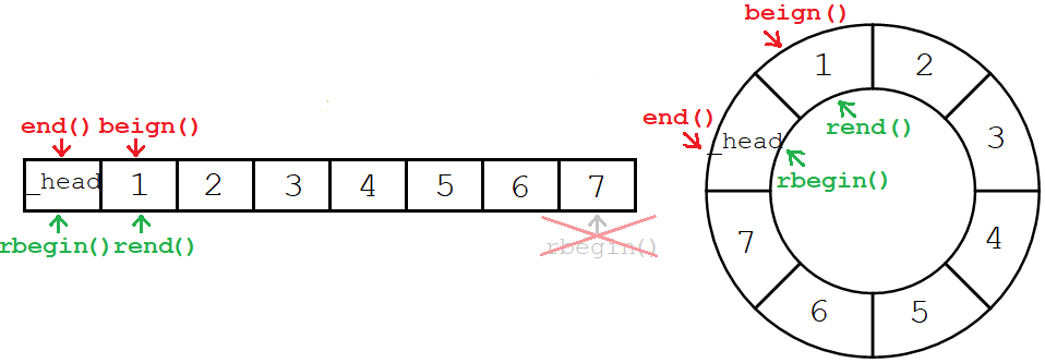 指向的位置正好对应相反。目的是设计出对称形式,因此解引用时返回的是上一个位置的数据。