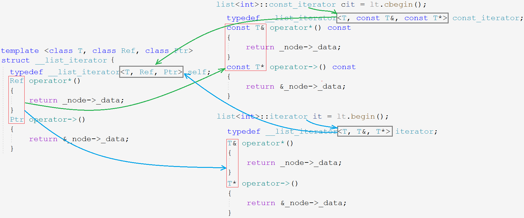 typedef __list_iterator<T, const T&, const T*> const_iterator; // 传入常量类型