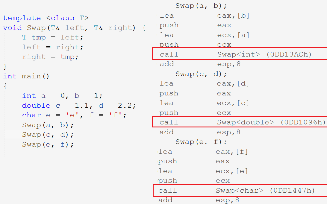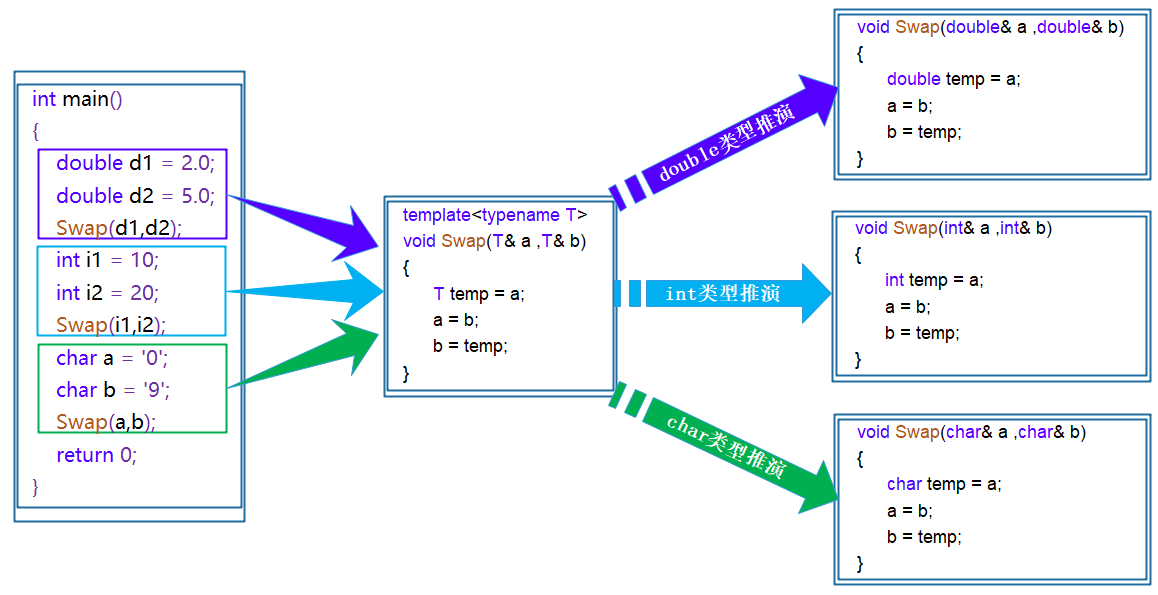 隐式实例化:编译器根据实参类型自动推演形参类型。