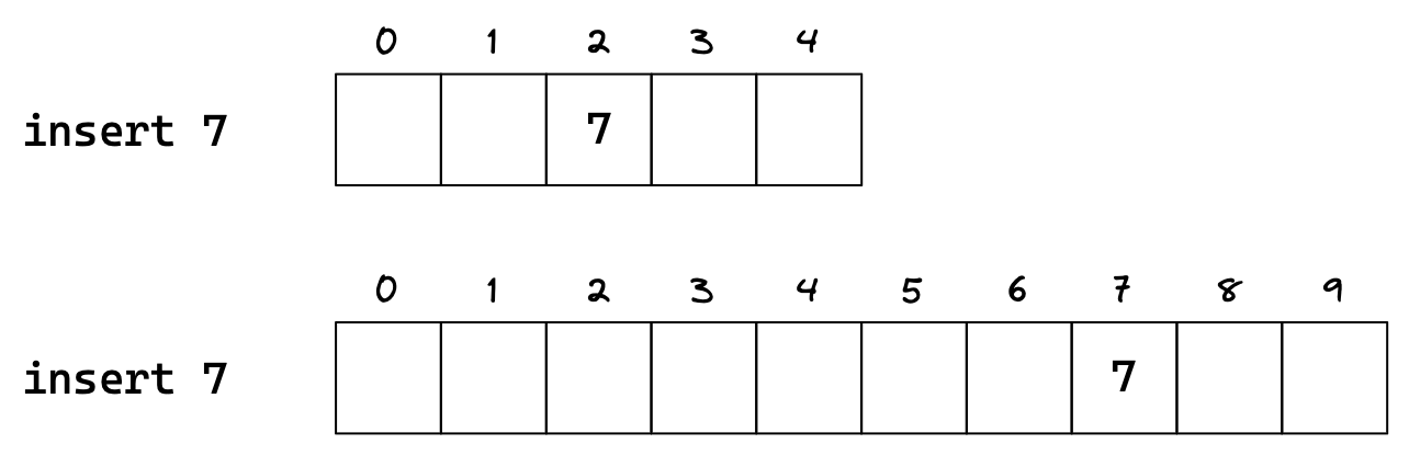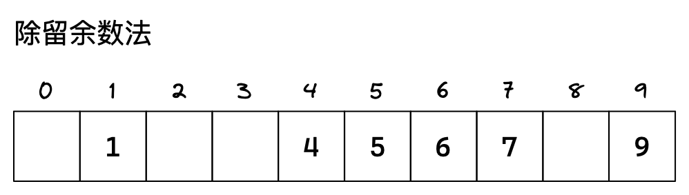 例如,存在数据集合 $[1,7,6,4,5,9]$,将哈希函数设置为 $hash(key)=key;%;capacity$,$capacity$ 为存储空间总的大小。