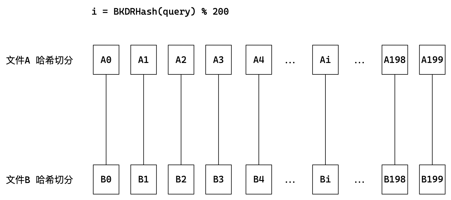 因为文件A和文件B用同一个哈希函数,所以两个文件中相同的query一定进入了同一个编号的小文件中。所以只要对比编号相同的哈希桶是否存在相同的元素即可。