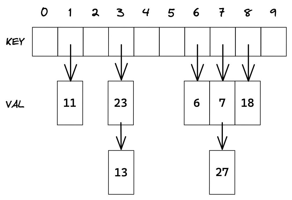 很可能存在不同数值映射到同一位置的情况,比如$10%10=0,;20%10=0$。这就是哈希冲突或称哈希碰撞。