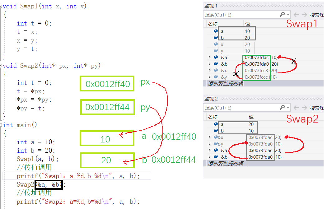 由右图的监视可看出,Swap1 函数 x 和 y 确实发生了交换,但并没有影响到 a 和 b。Swap2 函数的 px、py 和 &a、&b 是一个意思。