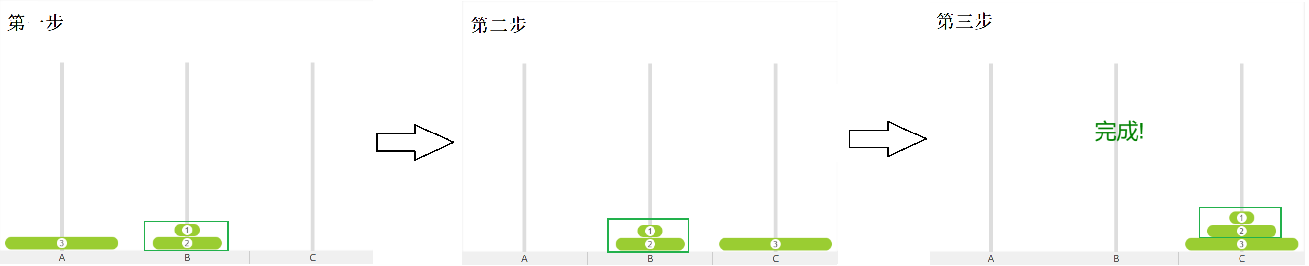 有三根柱子,分别为A、B、C ,A柱上从上到下依次排列着由小到大的圆盘,我们需要把圆盘从A柱按照同样的摆放顺序放到C柱上,期间我们可以借助B柱。