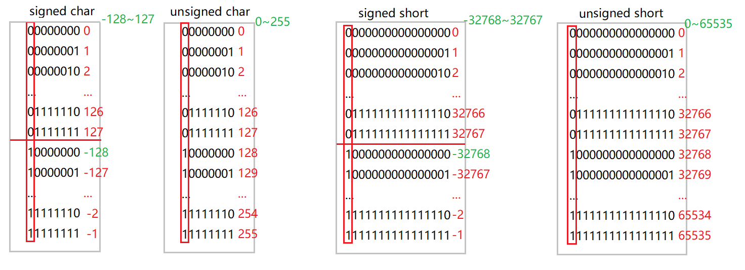 有符号和无符号的区别在于存在内存中的二进制序列的最高位是符号位还是数值位。