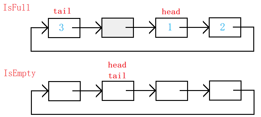 循环队列可由数组和链表两种方式实现,数组则是通过下标循环,链表是循环链表。