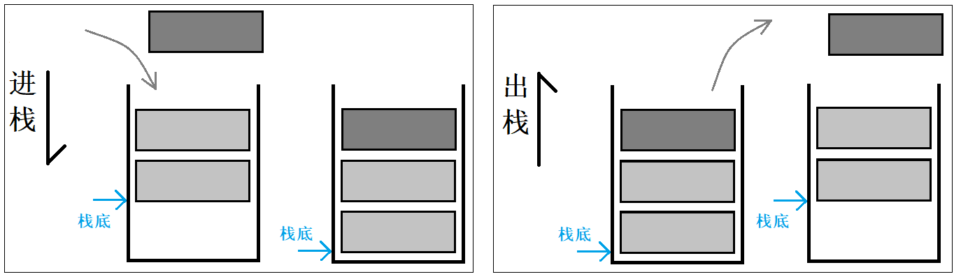 - 出栈:栈的插入操作被称为出栈,或称弹栈。