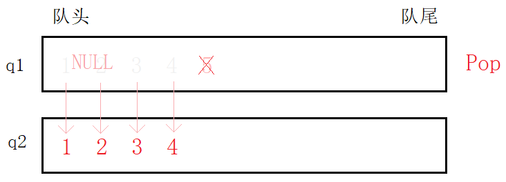 将元素从“入栈”移到“出栈”,等于将元素逆置,逆置后的栈出栈操作而言已然和队列的出队一样。相当于将栈底的元素从栈底出栈,也就是从先进后出变成先进先出,模拟实现了出队。