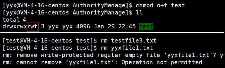 如果不想让非目录所有者用户具有删除目录下文件的权限,针对这种需求,Linux 下可以使用粘滞位解决。