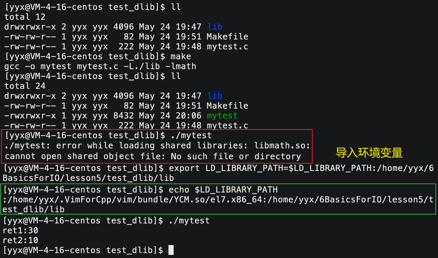 由于动态库是运行时链接,运行程序时,系统加载器默认只会加载系统默认库的路径。所以我们需要告诉加载器依赖库的路径,将库路径放入环境变量LD_LIBRARY_PATH