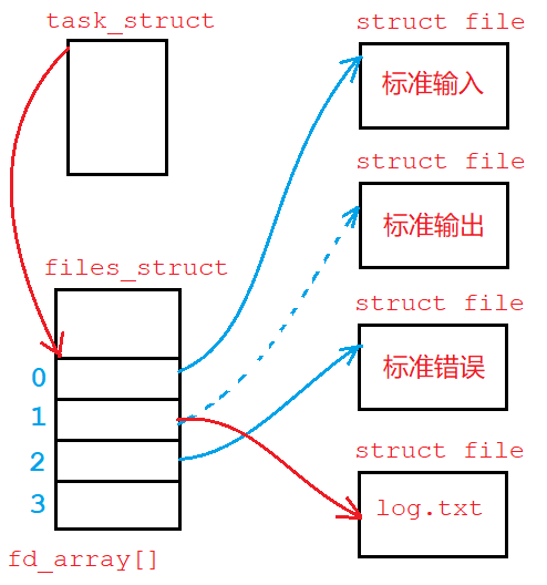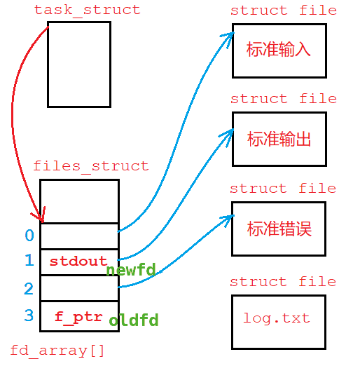 把 newfd 指向的文件地址拷贝给 oldfd 位置,自此就可以通过 oldfd 访问新文件了。