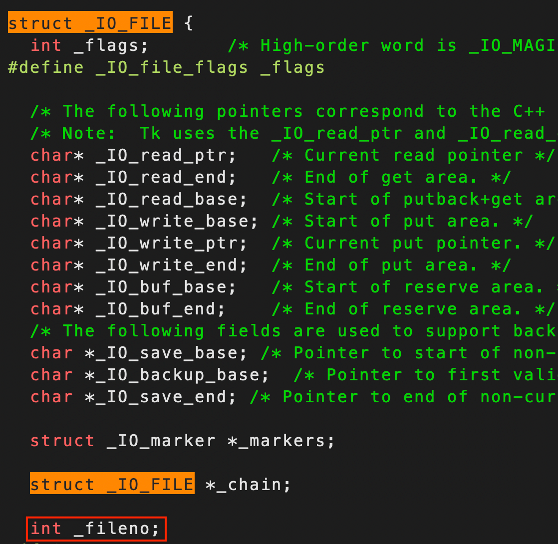 printf("%d\n", stdin->_fileno); // stdin/stdout/stderr中封装的有fd