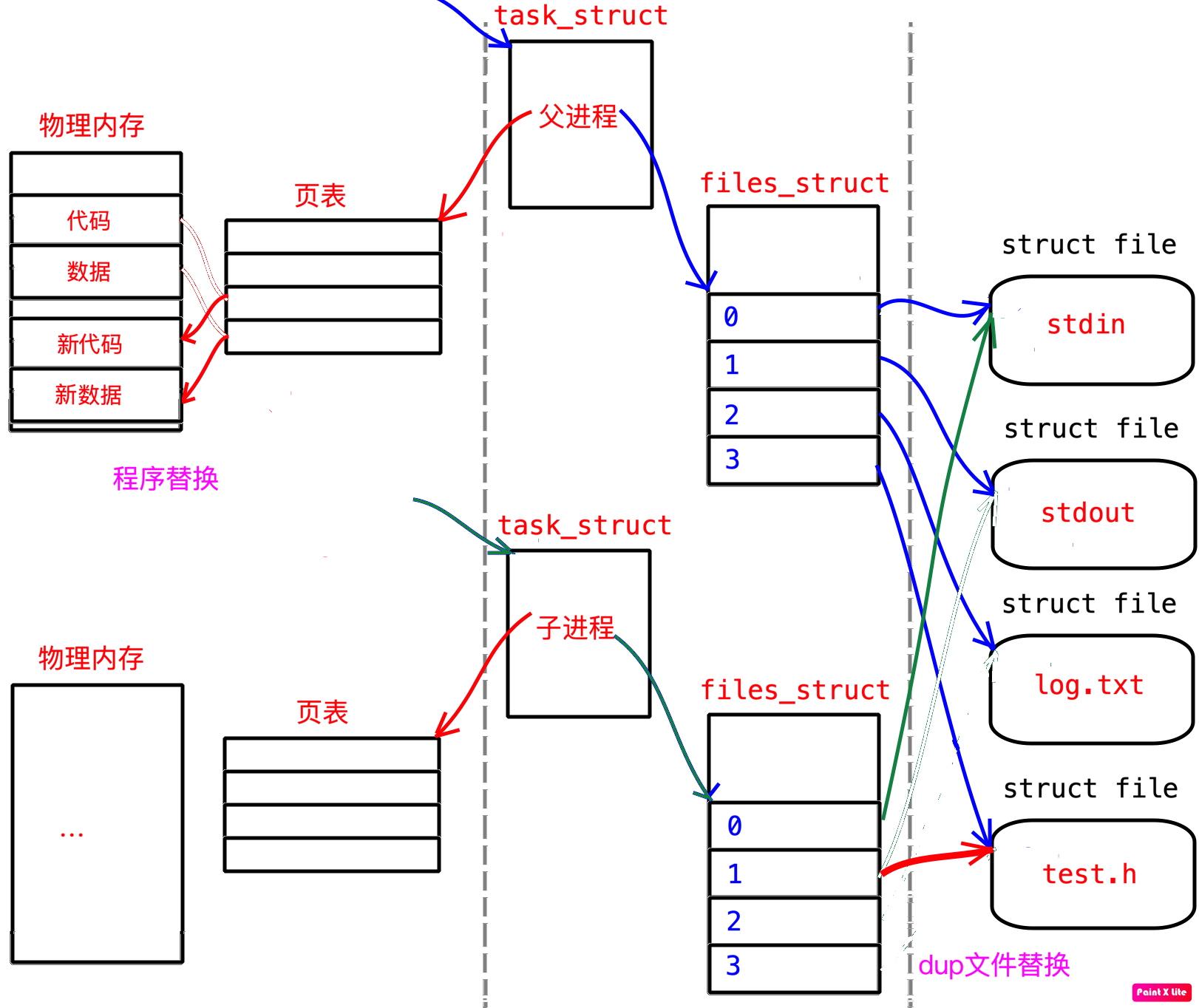 - 进程程序替换后dup2的作用并不会消失。修改代码数据和修改进程文件描述符表,二者并不冲突。
